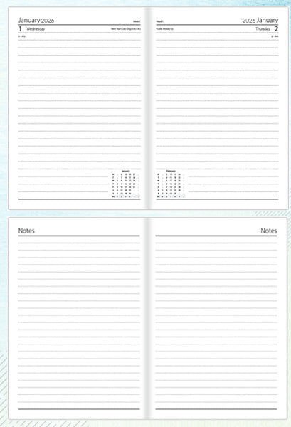 - Pages include: Year Planner 2026, Personal Notes, Calendar 2025/2026/2027, Metric Information & Clothing Sizes Also includes International Information, Holidays & Notable UK Dates, General Information - Sunrise/Moon Phases