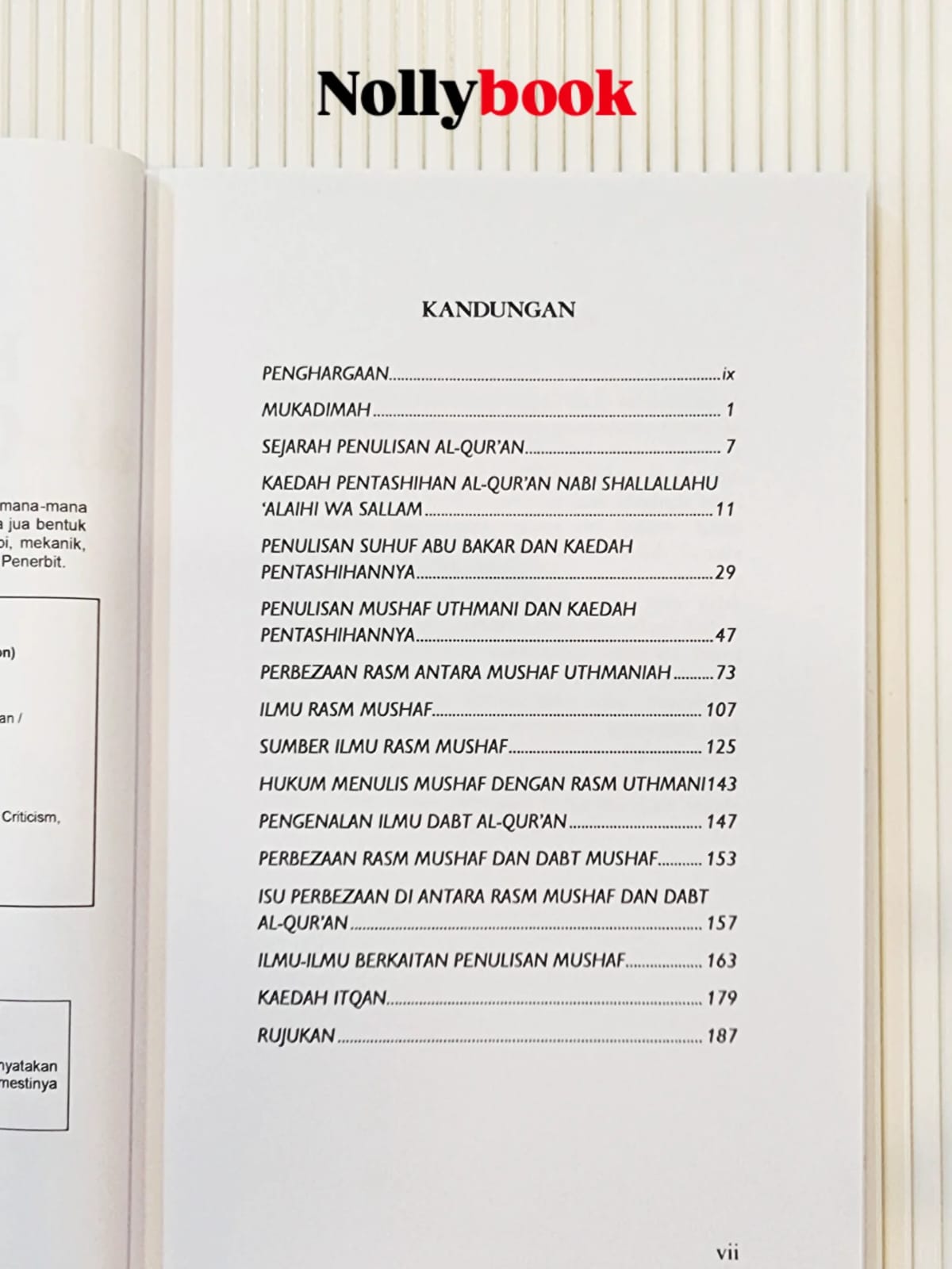 Buku ini menghidangkan informasi asas tentang latar belakang penulisan dan pentashihan al-Qur’an. Antara topik yang dibincangkan ialah sejarah penulisan dan pentashihan al-Qur’an zaman Nabi (s.a.w.), zaman Abu Bakar r.a, zaman Uthman r.a., pengenalan tentang ilmu Rasm Uthmani dan ilmu Dabt al-Qur’an, juga ilmu-ilmu berkaitan penulisan al-Qur’an.